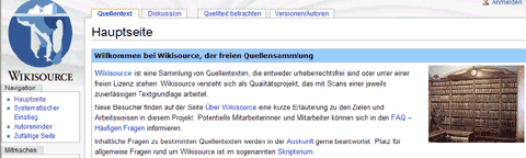 Wikisource sammelt und veröffentlicht Quellentexte, die entweder urheberrechtsfrei sind oder unter einer freien Lizenz stehen. Wikisource versteht sich als Qualitätsprojekt, das mit Scans einer jeweils zuverlässigen Textgrundlage arbeitet.