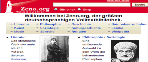 Willkommen bei Zeno.org, der größten deutschsprachigen Volltextbibliothek heißt es zwar etwas vollmundig auf der Startseite, aber die vorhandenen Inhalte sind wirklich beeindruckend. Texte aus allen Wissens- und Interessensgebieten stehen zur freien Verfügung. Die angefügten Quellenangaben erlauben es auch, auf Inhalte zu verweisen oder einzelne Textabschnitte zu zitieren.