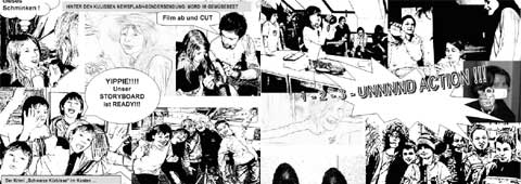 Wann drahn ma denn unseren Film?, fragte er uns. Ach ja genau, unser Film .... In unserer Lesenacht verfilmten wir in Gruppen einige Ausschnitte aus gelesenen Büchern und ich drehte mit Tommi, Krise, Manu, Wurzer, Martin und Gregor einen Teil aus dem Buch James Bond Junior: Zurück kommt nur der Tod!. Bald, nach dem Essen, passt?, fragte ich ihn. Okay, wir holen daweil in Wurzer und in Manu!, sagte Gregor und ging. Schweißperlen tropften an meinem Gesicht herunter, mein Magen krümmte sich zusammen und meine Augen fixierten einen Punkt im schwarzen Nichts.