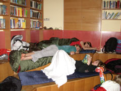 Da wir alle schwere Taschen hatten, durften wir immer in Gruppen mit dem Lift in die Bibliothek hinauffahren. Einige Schüler (nur Schüler) benutzten die Treppe, darunter mein Freund Thomas und ich. Auf den Weg nach oben besprachen wir, wohin wir uns schlafen legen wollten. Als wir oben ankamen, bereiteten wir unsere Nachtquartiere vor.